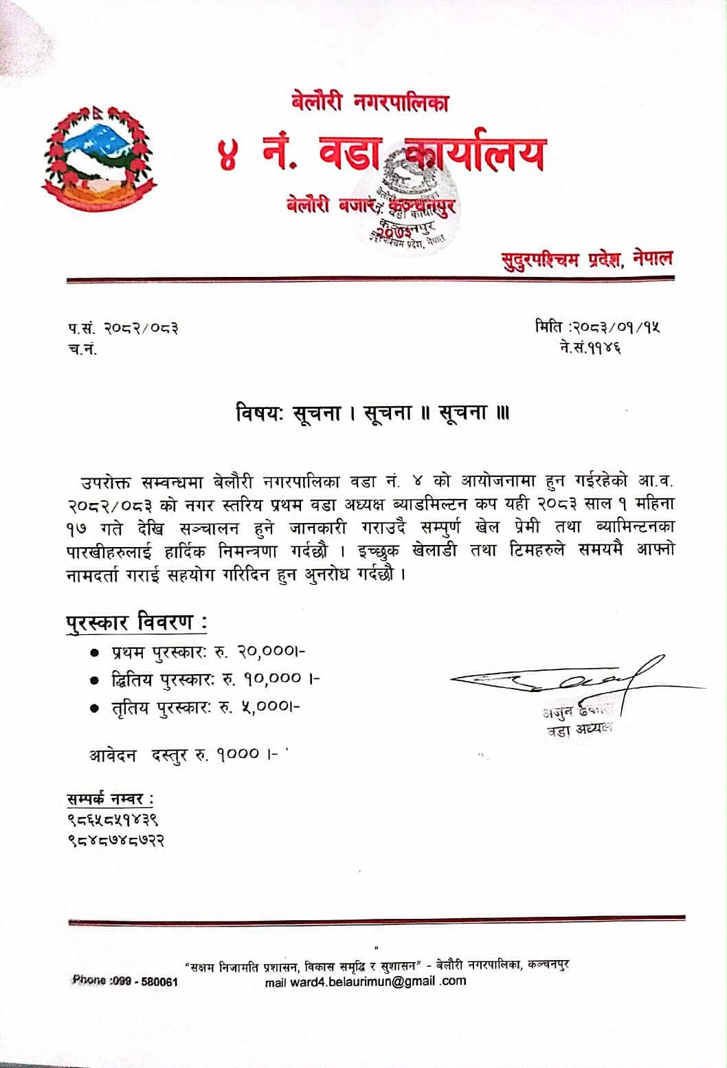 कञ्चनपुरके बेलौरी नगरपालिका वडा नं. ४ के आयोजनाम नगरस्तरीय प्रथम वडा अध्यक्ष ब्याडमिन्टन कप प्रतियोगिता यह वैशाख १७ गतेसे सुरु हुइना बा।